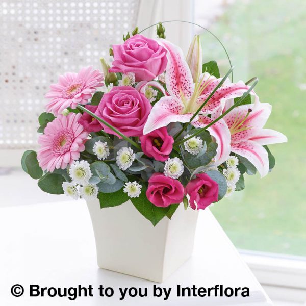 This is a very popular gift, the flowers are expertly arranged in florist foam and the recipient can sit back and enjoy their present. Arranged in a cream ceramic pot , this lovely selection of roses, germini ,lilies, lisianthus, chrysanthemum and foliage producing a very pretty display. Just water and enjoy.